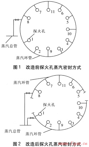 改造方案是:將原來的蒸汽環(huán)管從中間截斷成兩半,一半沿用原來的探火蒸汽管和閥門,只是將兩端用堵頭堵住,主要用來密封5、6、7、8、11號探火孔;用1根直徑為40mm的無縫鋼管從蒸汽總管引至另一半環(huán)管上,加裝1個DN 40mm的截止閥作為控制用,這一半環(huán)管主要用來密封1、2、3、4、9、10號探火孔。經(jīng)過這一改進(jìn)后,提高了密封煤氣的蒸汽壓力,解決了在探火時因蒸汽壓力較低而造成密封效果較差、煤氣泄漏嚴(yán)重的問題。