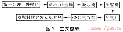 結(jié)合蘇里格氣田現(xiàn)狀,氣源來自蘇里格氣田第一天然氣處理廠,原料氣壓力為4.5~5.2MPa,溫度為0~20℃,經(jīng)調(diào)壓、計量、深度脫水后壓縮至20MPa,用CNG氣瓶車運輸至井場,在井場調(diào)壓后供雙燃料機組使用。根據(jù)工藝要求,需要的設備主要有調(diào)壓計量裝置、脫水裝置、壓縮機、加氣柱、CNG氣瓶車、雙燃料鉆井發(fā)動機機組前調(diào)壓計量裝置。工藝流程見圖1。