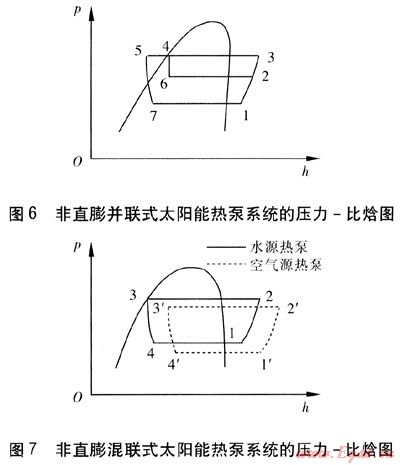 直膨式、非直膨并聯(lián)式、非直膨混聯(lián)式太陽能熱泵系統(tǒng)的壓力-比焓(p-h)圖見圖5~7。由圖5可知,在直膨式太陽能熱泵系統(tǒng)中,由冷凝器出來的工質(zhì)經(jīng)過膨脹閥節(jié)流(4-1)后到達(dá)太陽能集熱器,吸收太陽能后氣化(1-2),再進(jìn)入壓縮機(jī)壓縮后變?yōu)楦邷馗邏旱臍怏w(2-3),最后進(jìn)入冷凝器放熱(3-4)。