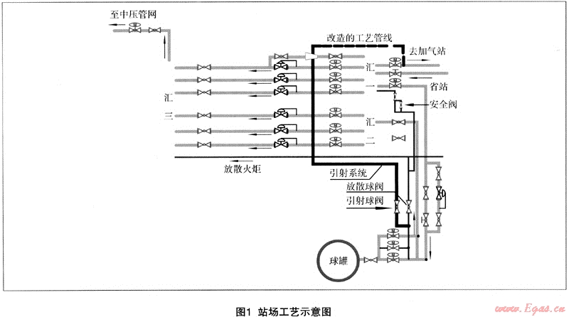 把站場(chǎng)引射器下方管線和加氣站進(jìn)氣管道連接起來(lái),關(guān)閉匯一集氣罐上到加氣站去的球閥。這樣就用球罐存氣通過(guò)引射管道供光明村加氣站運(yùn)行,球罐晚間進(jìn)氣到高壓0.92MPa,白天通過(guò)引射管線供加氣站。見圖1。