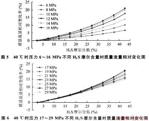 圖5、6分別給出了基于前述基準(zhǔn)條件,40℃時(shí)壓力為6~16MPa、17~29MPa和不同HzS摩爾含量時(shí)質(zhì)量流量變化情況。可見(jiàn)質(zhì)量流量變化主要受到H2S含量的影響,均隨H2S摩爾分?jǐn)?shù)增加而增加。相同H2S摩爾分?jǐn)?shù)時(shí),6~16MPa的質(zhì)量流量隨壓力增加的變化速度明顯加快,而在19~29MPa范圍時(shí)又隨壓力增加變化速度變慢。