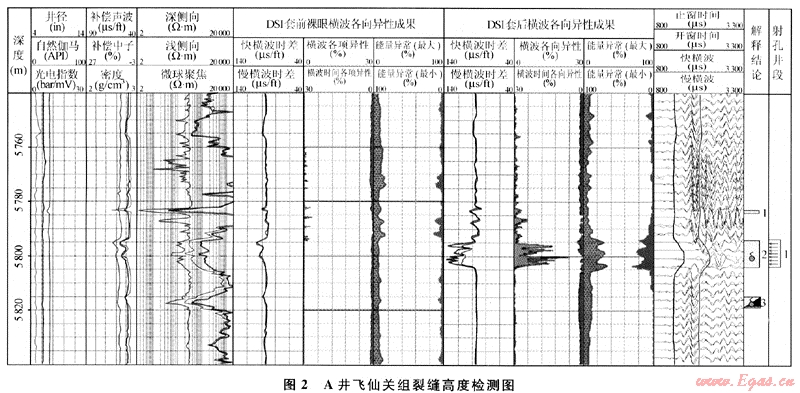 圖1是LG地區(qū)A井裂縫高度預(yù)測(cè)圖,可以看出:當(dāng)壓力增量為1MPa時(shí),形成高度為8m的壓裂縫,壓裂縫延伸井段為5794~5804m;當(dāng)壓力增量超過(guò)1.0MPa時(shí),壓裂縫繼續(xù)略有延伸。用A井套前、套后交叉偶極橫波測(cè)井資料檢測(cè)[5]了其裂縫高度(圖2),可以看出:壓裂前,5794~5804m各向異性不明顯,壓裂后,該井段呈現(xiàn)一定的各向異性,由此判斷壓裂縫井段為5794~5 804m,縫高為8m,表明該井實(shí)際的水力壓裂裂縫井段為5794~5804m,與預(yù)測(cè)結(jié)果一致。