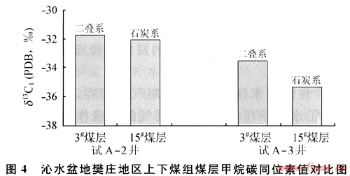 徑流水區(qū)地下水對煤層氣破壞的現(xiàn)象除了使含氣量降低以外,主要表現(xiàn)在流動的地下水可使煤層甲烷碳同位素變輕,變輕的程度受水動力強度影響。在我國的華北地區(qū),下部太原組煤系直接覆蓋在奧陶系灰?guī)r之上,煤系與下伏奧陶系石灰?guī)r巖溶裂隙含水層強徑流帶容易產生水力聯(lián)系,所以太原組下主煤層的煤系水動力條件往往強于山西組上主煤層煤系。在煤層甲烷碳同位素值方面,下煤組煤層甲烷碳同位素輕于上煤組的現(xiàn)象十分普遍。例如鄂爾多斯盆地吳堡地區(qū),上煤組的3#煤層中的甲烷碳同位素值為-38.25‰,下煤組的10#煤層的甲烷碳同位素值為-46.26‰;沁水盆地試A-2井3#煤層和15#煤層甲烷碳同位素值分別為-31.8‰和-32.1‰;試A-3井甲烷碳同位素值分別為-33.56‰和-35.39‰(圖4)。
