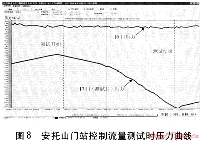 從圖7可見,在測試時段,流量基本可控制在控制線以下,當停止測試時,不進行持續(xù)降壓,管道儲氣將不再被利用,流量將很快回升到用戶需求量。從圖8可見,壓力由1.4MPa降到1.275MPa,變化平穩(wěn)。