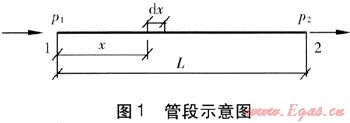 取長度為L的蒸汽管段為研究對象(見圖1),設(shè)管段起始節(jié)點為1,對應(yīng)壓力為p1;末端節(jié)點為2,對應(yīng)壓力為p2