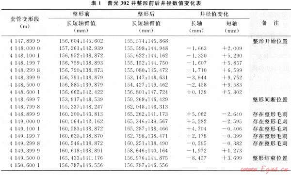 為了檢驗(yàn)整形效果和了解整形后套管回彈情況,整形24h后用40臂井徑測井儀器復(fù)測,整形段套管內(nèi)徑變化對(duì)比見表1。從表1中可以看出,套管變形嚴(yán)重井段4148.0~4148.6m的長軸徑值縮短1.3~3.6mm;短軸徑值增加2~9.7mm,具有較明顯的整形效果;井段4148.9~4149.3m整形效果不理想,該處為套管接箍,分析存在套管整形毛刺。