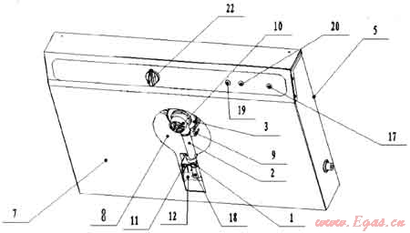 如圖1所示,在本具體實(shí)施例中,本研究項(xiàng)目立式家用燃?xì)庠畎ü鈾C(jī)構(gòu)、點(diǎn)火機(jī)構(gòu)、燃燒機(jī)構(gòu)以及可豎立擺放在櫥柜臺(tái)面或桌面4上或安裝在緊挨櫥柜臺(tái)面或桌面4的墻壁上的灶具主殼體5,此時(shí)灶具主殼體5的高度和寬度都明顯大于其厚度;所述供氣機(jī)構(gòu)包括進(jìn)氣管20、旋塞閥21和旋鈕22,所述進(jìn)氣管28與旋塞閥21相通,所述旋鈕22安裝在旋塞閥21上,所述旋塞閥21通過(guò)分氣管25及分氣管接頭26與連接件19連接相通;所述點(diǎn)火機(jī)構(gòu)包括脈;中點(diǎn)火器23和點(diǎn)火針24,所述脈沖點(diǎn)火器23與旋塞閥21連接相通并通過(guò)導(dǎo)線與點(diǎn)火針24連接,所述點(diǎn)火針24設(shè)置在爐頭3上;所述燃燒機(jī)構(gòu)包括噴嘴1、引射管2、爐頭3和鍋架9;所述噴嘴1的一端與連接件18連接相通,其另一端與引射管2的一端連接相通;所述引射管2的另一端與爐頭3連接并與爐頭3的火孔相通;所述爐頭3連接有鍋架9:所述灶具主殼體5的后殼面6上連接有轉(zhuǎn)軸固定架11,所述轉(zhuǎn)軸固定架11上設(shè)有一根與其相對(duì)轉(zhuǎn)動(dòng)的轉(zhuǎn)軸12;所述燃燒機(jī)構(gòu)后端的連接件19與灶具主殼體5后殼面6的轉(zhuǎn)軸12連接;所述灶具主殼體5的前殼面7上設(shè)有供燃燒機(jī)構(gòu)在轉(zhuǎn)動(dòng)過(guò)程中通過(guò)的孔8,如圖2所示;所述爐頭3底部連接有一個(gè)爐頭支撐架10。在本具體實(shí)施例中,本研究項(xiàng)目還在爐頭3邊安裝有熱電偶式熄火保護(hù)裝置27。
