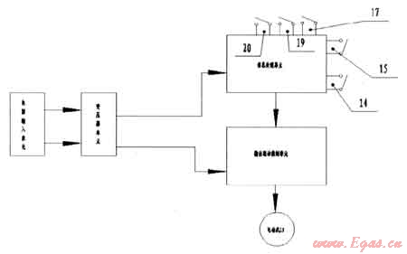 如圖4所示,本具體實(shí)施方式中,所述控制電路板16包括電源輸入單元、變壓器單元、、信息處理單元以及輸出驅(qū)動(dòng)控制單元;所述電源輸入單元與變壓器單元電連接;所述變壓器單元與信息處理單元和輸出驅(qū)動(dòng)控制單元電連接:所述信息處理單元與輸出驅(qū)動(dòng)控制單元電連接;所述輸出驅(qū)動(dòng)控制單元與電動(dòng)機(jī)13電連接;所述信息處理單元與電源輸入控制開(kāi)關(guān)17、上升開(kāi)關(guān)19、下降開(kāi)關(guān)20、上限位開(kāi)關(guān)14及下限位開(kāi)關(guān)15。由于本研究項(xiàng)目實(shí)現(xiàn)自動(dòng)化控制的工作電路原理采用的是現(xiàn)有常規(guī)技術(shù),故其具體的電路連接關(guān)系不在此贅述。