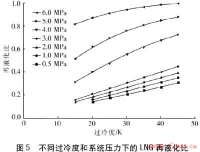 改變?cè)螸NG的過冷度和系統(tǒng)壓力進(jìn)行模擬,得到不同狀態(tài)參數(shù)下的LNG再液化比,見圖5。