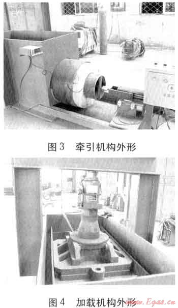 沙箱試驗機由沙箱、加載機構、牽引機構、電氣控制、測力傳感器、行程開關、計算機等部分組成。沙箱試驗機結構見圖2,牽引機構、加載機構外形分別見圖3、4。牽引機構由擺線針輪減速機、電動機、傳動部件等組成,牽引機構通過測力傳感器與工作管相連。試驗時牽引機構在行程開關的配合下使工作管作直線往復運動(每個行程100mm),測力傳感器通過顯示器顯示推力、拉力。沙箱試驗機可在空載、加載狀況下進行操作,在進行加載試驗時通過千斤頂對試件加載,加載力傳感器通過顯示器顯示加載力。由計算機計算空載時平均推(拉)力與加載時平均推(拉)力的比值。沙箱兩側焊接20號槽鋼,并焊接橫梁支撐,便于安裝千斤頂(見圖4)。沙箱底部設置與牽引機構、電控及儀表箱相連的支座。