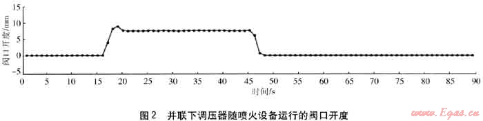 為了測量雙路調(diào)壓器供氣時的閥口開度是否均衡,我們采用了激光測位儀,對調(diào)壓器的運動行程進行同步測量。根據(jù)調(diào)壓器位置不同,分為并聯(lián)上調(diào)壓器和并聯(lián)下調(diào)壓器,并聯(lián)下調(diào)壓器隨噴火設(shè)備運行的閥口開度見圖2,圖2與圖1在時間上相對應(yīng)。