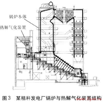 熱解氣化技術是將農(nóng)林生物質(zhì)在缺氧或微氧狀態(tài)下通過高溫化學反應,將其分解成可燃氣體,作為鍋爐設備的燃料,實現(xiàn)能量的轉(zhuǎn)換。目前熱解氣化技術主要用于發(fā)電。某秸稈發(fā)電廠鍋爐與熱解氣化裝置結(jié)構(gòu)見圖3[19~20]。這種熱解氣化裝置在結(jié)構(gòu)上類似往復爐排,秸稈在熱解氣化裝置內(nèi)轉(zhuǎn)化為可燃氣體,燃氣從鍋爐底部進入燃燒室進行燃燒。作為熱化學轉(zhuǎn)化的一種工藝方法,熱解氣化技術利用熱解氣化裝置將農(nóng)林生物質(zhì)經(jīng)過轉(zhuǎn)化產(chǎn)生的燃氣直接供給鍋爐設備燃燒。以熱化學為基礎的熱解氣化技術,強化了生物質(zhì)的能量密度和能量強度,提高了其利用品位。