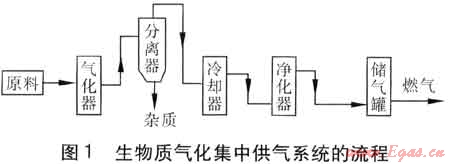 目前,生物質(zhì)資源的處理方式主要有生物質(zhì)氣化技術[12~14]、固化成型技術[15~18]。國內(nèi)提出的生物質(zhì)氣化集中供氣系統(tǒng)的流程見圖1。該技術采用氣化的方法將農(nóng)林生物質(zhì)轉(zhuǎn)換為可燃氣體,氣化效率達到了72%~75%,燃氣低熱值達到5MJ/m3。生物質(zhì)固化成型技術是將農(nóng)林生物質(zhì)粉碎后,通過成型設備加工成顆粒、塊、棒、片等形狀直接燃燒。固化成型技術的工藝、設備簡單,燃料便于儲存和長途運輸,易于實現(xiàn)產(chǎn)業(yè)化大規(guī)模生產(chǎn)和應用。這種技術不需特殊的燃燒設備,對現(xiàn)有鍋爐設備進行簡單改造即可,技術經(jīng)濟性能相對較高。