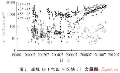 Cl-含量的變化在一定程度上反映地層水的侵入程度,當(dāng)氣井所產(chǎn)水由凝析水變?yōu)檫叺姿畷r,Cl-含量或礦化度有較大的變化。通過對氣田單井Cl-含量分析,證明部分井在2006年后受地層水侵入(圖2)。