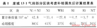 借鑒物質(zhì)平衡原理,將氣藏模擬為單獨儲罐體,并考慮有外來氣體通過薄的可滲透邊界不斷流入氣藏的情況下,建立新的補(bǔ)給氣藏物質(zhì)平衡方程,計算出氣田區(qū)塊間存在的補(bǔ)給漏失量(表1),其中N區(qū)塊補(bǔ)給量高達(dá)近43×108m3,很好地解釋了動用程度超百的現(xiàn)象,考慮補(bǔ)給后動用程度為86%,而其余區(qū)塊考慮漏失后動用程度相應(yīng)有所增加。