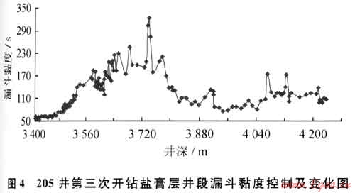 將“護膠為主、降黏為輔”作為調(diào)控各項性能的指導原則;適當降低井漿中的膨潤土含量,以降低其發(fā)生各種污染的可能性。高密度飽和鹽水鉆井液由于其密度高、固相含量大,體系本身所固有的固相容量限已被壓縮至一個很窄的范圍,一旦進入體系的劣質(zhì)固相(如鉆屑粉末、泥巖細顆粒等)來不及清除,累積到一定程度若其超過體系固相容量上限時,各種固相粒子極易連接形成結(jié)構(gòu),導致鉆井液的黏度和切力增加,從而也會以污染形式表現(xiàn)出來[3~5]。如2009年3月205井在第三次開鉆鹽膏層井段(3402~4237m)鉆進過程中所發(fā)生的情況(圖4)就是如此,具體表現(xiàn)為鉆井液“黏土固相侵”,黏切劇增,流變性能失穩(wěn)。