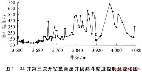 采取的具體措施包括:維持體系較低的堿性(即pH值一般保持在8~9);適當放大量以膠液形式補充各類處理劑進入體系以維護鉆進過程中材料的正常消耗;在井漿中不斷補充NaCl甚至到飽和以提高其整體抑制性;補充KCl至一定量以形成對黏土質(zhì)成分應(yīng)有的抑制效果等。圖5為31井第三次開鉆鹽膏層井段漏斗黏度控制及變化情況,由于加強了對鉆井液整體抑制性的維護,鉆井液流變性能明顯較好。
