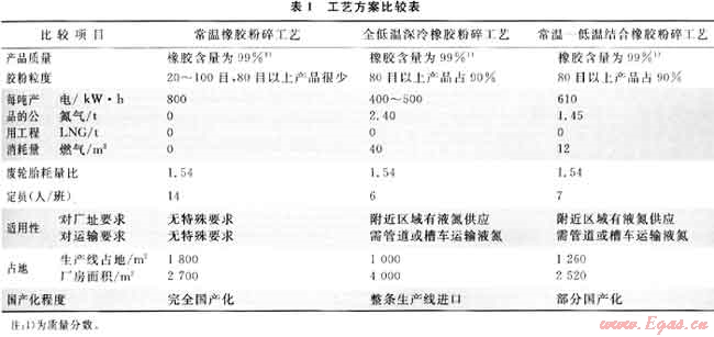 常溫橡膠粉碎工藝、全低溫深冷橡膠粉碎工藝和常溫和低溫相結(jié)合橡膠粉碎工藝的比較見表1[9]。