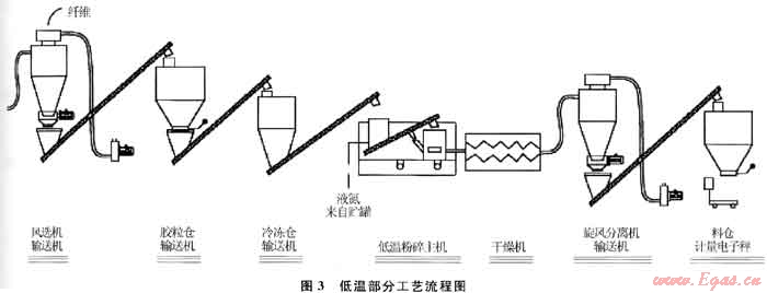 從常溫料倉出來的20~30目的常溫膠粉通過螺旋輸送機(jī)輸送到冷凍室進(jìn)行冷凍。冷凍室由入口氣塞、出口氣塞和液氮控制系統(tǒng)組成。液氮將膠粉從常溫冷凍到玻璃化溫度,而冷凍室內(nèi)的螺旋推進(jìn)器可以推動膠粉通過冷凍室。冷凍室由不銹鋼內(nèi)筒、電鍍外殼和中間絕緣部件組成,并安裝有橡膠涂層的傳動輪,使裝置能有效旋轉(zhuǎn)并保持磨損最小。經(jīng)冷凍室冷凍過的膠粉再由螺旋輸送機(jī)輸送到細(xì)碎機(jī)進(jìn)行進(jìn)一步的粉碎。細(xì)碎機(jī)的電機(jī)功率一般為50~150kW,帶有變頻驅(qū)動器,可以按要求粉碎出80目以上的膠粉產(chǎn)品。經(jīng)過細(xì)碎機(jī)細(xì)碎的膠粉通過螺旋輸送裝置輸送到干燥系統(tǒng)進(jìn)行干燥,干燥系統(tǒng)配有熱風(fēng)爐,由風(fēng)機(jī)把加熱后的空氣送入干燥機(jī)對膠粉進(jìn)行加熱,以此來去除膠粉中的水分,防止膠粉在輸送過程中出現(xiàn)結(jié)塊和堵塞現(xiàn)象。在干燥機(jī)的末端有1套分離系統(tǒng)負(fù)責(zé)不同粒度膠粉的分離,通過這套分離系統(tǒng)可以把大顆粒的膠粉分離出來送回冷凍室進(jìn)行進(jìn)一步的粉碎,分離后的合格固體膠粉進(jìn)入細(xì)粉料倉進(jìn)行稱重、包裝和成品入庫。該流程如圖3所示。