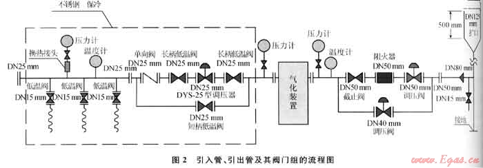 每個(gè)貯液罐的出口處均裝有公稱直徑為15mm的低溫球閥,閥后均用公稱直徑為15mm的金屬軟管與工質(zhì)引入管連接,引入管的一端封死,另一端連接在上盤管進(jìn)口集箱的下封蓋上。引入管上裝有閥門組,起到阻止低溫工質(zhì)回流、截止管路流通和調(diào)節(jié)管道壓力等作用。引出管上也裝有閥門組,同樣起到截止管路流通和調(diào)節(jié)管道壓力等作用,其流程圖如圖2所示(圖2中所示LNG加熱氣化裝置的左側(cè)為引入管閥門組的流程圖,右側(cè)為引出管閥門組的流程圖)。引出管閥門組后裝有阻火器,以防室外雷電等回火進(jìn)入裝置。阻火器后的引出管管徑擴(kuò)大為80mm,沿實(shí)驗(yàn)室外墻升到屋頂上空,將氣化后的天然氣排入大氣。為消除排氣引起的噪音,排氣管道末端裝有擴(kuò)口消音器,并裝有避雷針,防止雷擊。