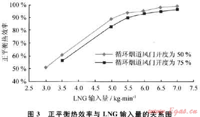 圖3為正平衡熱效率與LNG輸入量的關(guān)系圖。從圖3可以看出,裝置正平衡熱效率隨工質(zhì)LNG輸入量的增大而提高,當(dāng)循環(huán)煙氣量增大(即循環(huán)煙道調(diào)風(fēng)門的開度從50%增大到75%)時(shí),裝置正平衡熱效率反而降低,原因是循環(huán)煙氣量增大,導(dǎo)致混合煙氣溫度降低,使傳熱溫差減小,LNG的吸熱量降低。