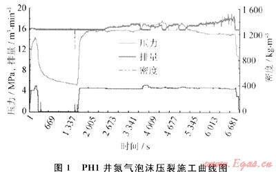 潘河示范工程項(xiàng)目采用研制的泡沫壓裂液進(jìn)行2口井的氮?dú)馀菽瓑毫?,圖1為PH1井的氮?dú)馀菽瓑毫咽┕で€圖。