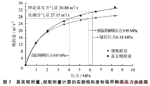 選取安陽礦區(qū)雙全井田-煤層氣參數(shù)井實(shí)測儲層參數(shù)及等溫吸附數(shù)據(jù),求取了真實(shí)吸附量和視吸附量下的吸附參數(shù),及由此推導(dǎo)出臨界解吸壓力和實(shí)測飽和度(表2、圖3)。等溫吸附實(shí)驗(yàn)溫度為20℃,測試煤層為二1煤層。