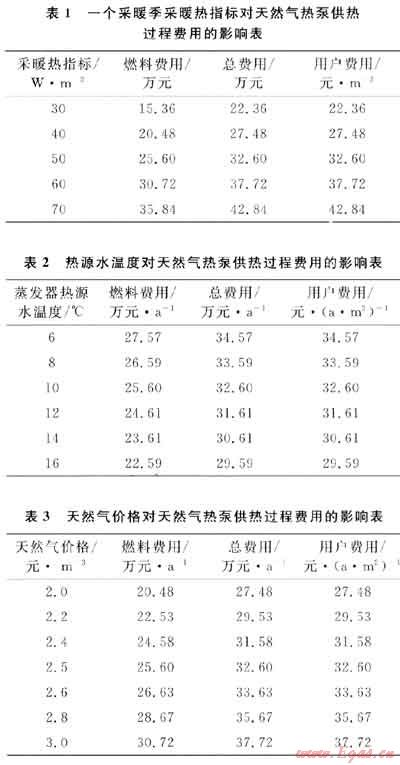 基本條件中,只有采暖熱指標(biāo)變化對(duì)天然氣熱泵供熱費(fèi)用的影響見表1;只有熱源水溫度變化對(duì)費(fèi)用的影響見表2;只有天然氣價(jià)格變化對(duì)費(fèi)用的影響見表3。由表可知,天然氣熱泵供熱費(fèi)以燃料費(fèi)用為主,降低采暖費(fèi)用的主要措施是提高燃料的利用效率。