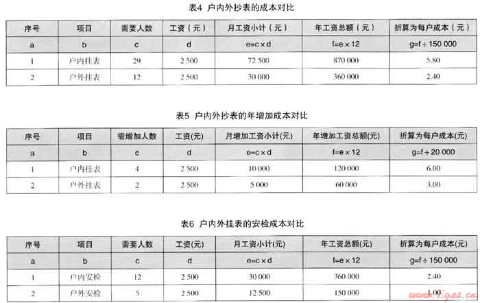 按照每年遞增新用戶(hù)2萬(wàn)戶(hù)為例,每年需要新增抄收人員為:戶(hù)內(nèi)抄表4人,戶(hù)外抄表2人。