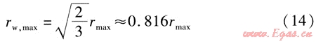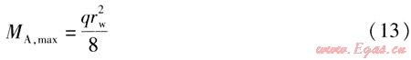 當MA,max=Mmax時,管道滿足強度條件。由式(1)、(13)得到活動支架A、B最大允許間距rw,max的計算式為: