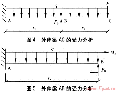 將L形轉(zhuǎn)角附近管段AC作為外伸梁處理,由于活動支架A處管道截面的變形量很小,為簡化計算,設定活動支架A處管道截面的轉(zhuǎn)角為零,這對工程計算結(jié)果的影響很小,可滿足工程設計需要。在設定活動支架A處管道截面轉(zhuǎn)角為零的前提下,外伸梁AC、AB的受力分析分別見圖4、5。