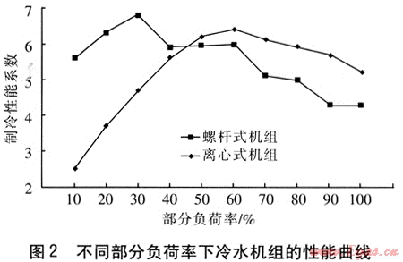 不同部分負(fù)荷率下冷水機(jī)組的性能曲線見(jiàn)圖2。離心式機(jī)組在部分負(fù)荷率為60%時(shí)制冷性能系數(shù)最大,而后隨著負(fù)荷增大而降低。螺桿式機(jī)組在滿負(fù)荷運(yùn)行時(shí)制冷性能系數(shù)最小,當(dāng)部分負(fù)荷率為30%時(shí)最大。