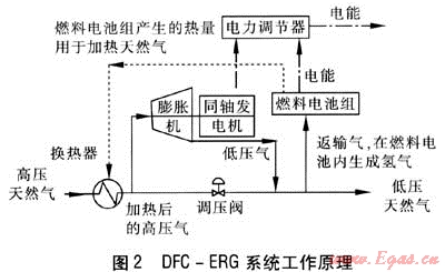 近年來,美國、英國一些公司將膨脹機技術與其他技術聯(lián)合,以回收調壓過程中的壓力能,研究工作取得了一定進展。2008年10月,北美Enbridge公司將膨脹機與燃料電池組合在一起形成DFC-ERG系統(tǒng)[6],并在加拿大多倫多門站進行了現(xiàn)場試驗,該聯(lián)合裝置的發(fā)電功率為2200kW。DFC-ERG系統(tǒng)工作原理見圖2。