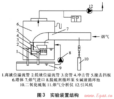 以石灰漿液為脫硫劑的雙液位噴射鼓泡煙氣脫硫除塵實驗裝置結(jié)構(gòu)見圖3,模擬煙氣垂直進入沖擊管在出口處卷吸液體向上流動,此過程中煙氣被加濕冷卻,煙氣中的二氧化硫和煙塵與脫硫劑接觸被吸收和去除。經(jīng)除塵和脫硫后的煙氣轉(zhuǎn)向向上流動,在撞擊擋板作用下水霧被分離,凈化后的煙氣由引風機排出。脫硫劑循環(huán)泵將脫硫劑不斷補入塔內(nèi)以保證塔內(nèi)液位,正常工作時脫硫劑通過高液位溢流管進行循環(huán)。調(diào)整二氧化硫瓶的閥門,可以改變二氧化硫濃度,通過測壓管可以測得在不同煙氣流量下的裝置阻力。煙氣分析儀可以測出煙氣中二氧化硫濃度的瞬時值和積分值。實驗規(guī)模:模擬煙氣量200~1000m3/h,煙氣進口處二氧化硫質(zhì)量濃度700~850mg/m3,空塔流速1~3m/s。