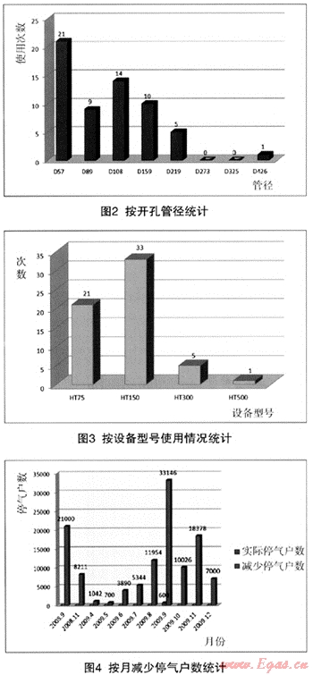 從統(tǒng)計圖中可以發(fā)現(xiàn),主要使用的設(shè)備為HT75、HT150系列,約占總數(shù)的90%,主要使用在帶氣開旁通,約占71%,管徑集中在D57—D159,約占90%,在施工過程減少停氣用戶約120000戶,減少了約6400m3燃氣的燃燒排放,節(jié)約1900m3的氮氣置換,避免了約4360h/人·次夜間施工作業(yè)。