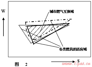 2. 城市燃?xì)饣Q域:一個城市有多種不同用途的燃具。每種燃具都有自己的燃具適應(yīng)域。將這些適應(yīng)域,集中在一個坐標(biāo)圖上(見圖2),就可以得到中間斜線的燃?xì)饣Q域。城市供應(yīng)的燃?xì)獗仨氃谶@些燃具的適應(yīng)域的范圍內(nèi)??梢娙?xì)饣Q域是受燃具適應(yīng)域制約的。其實互換性和適應(yīng)性的目的都是保證燃具正常工作,是一個事物的兩個方面?;Q性是對城市燃?xì)庹f的;適應(yīng)性是對燃具說的。在討論時不要混淆。