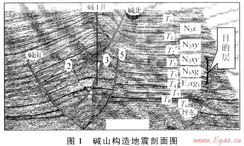 堿山構(gòu)造新近系自晚燕山運(yùn)動(dòng)以來(lái),先后經(jīng)歷了多次喜山運(yùn)動(dòng)[7]。強(qiáng)烈的擠壓構(gòu)造運(yùn)動(dòng),一方面在本區(qū)形成了背斜構(gòu)造,為天然氣的聚集提供了可能的場(chǎng)所,但另一方面構(gòu)造運(yùn)動(dòng)形成的斷裂,會(huì)破壞構(gòu)造的完整性,將構(gòu)造分割成不同的斷塊,不利于天然氣的聚集,其中堿北斷裂斷至地表,對(duì)成藏極為不利。堿山構(gòu)造淺層與深層以T3為界分成兩部分,深層構(gòu)造受早期高角度逆沖斷層控制,在剖面上表現(xiàn)為兩斷夾一隆基底卷入型構(gòu)造樣式;淺層構(gòu)造受淺層滑脫斷層即堿北斷層控制,形成蓋層滑脫型構(gòu)造樣式(圖1)。