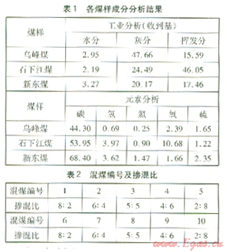 實驗用煤為烏峰煤、石下江煤、新東煤3種單煤,將烏峰煤分別與石下江煤、新東煤按不同比例摻混[5] 。