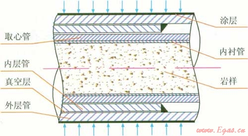 系統(tǒng)保溫筒設計如圖2,采用超高真空絕熱方式,在內(nèi)層管、外層管間抽真空;高真空層內(nèi)外表面噴涂等離子隔熱材料;外層管表面涂防陽光輻射涂料;在取心筒外面直接用保溫材料實施保溫。保溫結(jié)構設計簡單,現(xiàn)場可操作性強,使用方便。