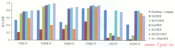 圖2 各種模型實(shí)測橫波與預(yù)測橫波相關(guān)系數(shù)圖