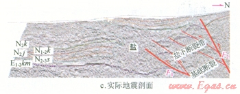 圖4-c、d、f為物理模擬實驗的解釋方案與實際地震資料解釋方案的對比,顯然只有早期存在鹽底辟的模擬實驗結果與地震剖面吻合,早期不存在鹽底辟的