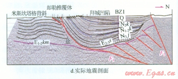 基底變形將鹽上的向斜北翼整體抬升,最前端的斷層F1,位于向斜沉積中心北邊,角度約為40°,F1的南邊基底不再發(fā)生構造變形。鹽上地層在初始鹽底辟位置發(fā)育了推覆距離很大的前緣逆沖斷層,并持續(xù)活動。以該前緣斷層為界,北端發(fā)育為鹽撤凹陷,呈巨大的向斜形態(tài),向斜的南北兩翼均可見紅白色石英砂逐漸減薄,為典型的生長地層形態(tài),代表伴隨擠壓的同構造沉積地層,前緣斷層上盤是博孜段淺層向斜的南翼。前緣斷層南端為幅度較小的卻勒區(qū)塊的米斯坎塔克背斜,背斜的北翼即為推覆體的下盤,南翼是未變形的鹽上沉積。