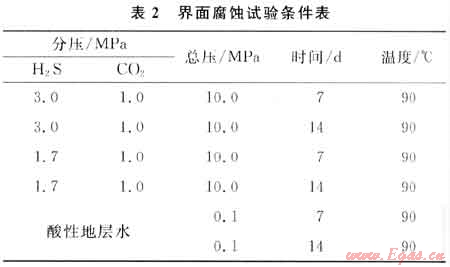 因此,筆者提出界面腐蝕的概念,并提出如下試驗(yàn)方案(由于川渝氣田含硫氣井井下主要的腐蝕介質(zhì)是H2S和C02等[4~5],因此腐蝕試驗(yàn)條件主要考慮此兩種酸性氣體):