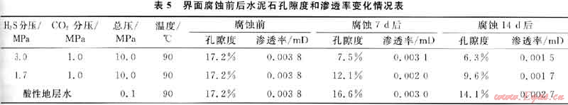 表5是指定水泥石在水濕H2S+C02復(fù)合酸性氣體環(huán)境及酸性地層水中界面腐蝕7d和14d后的孔隙度和滲透率變化情況。