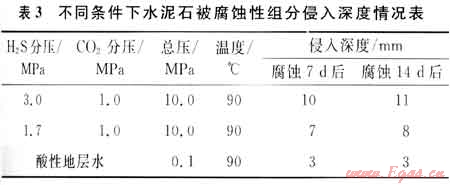 由表3數(shù)據(jù)可以看出:隨H2S分壓的增加,腐蝕性組分侵入深度增加;隨腐蝕時(shí)間的延長(zhǎng),腐蝕深度增挑水泥石在地層水環(huán)境中腐蝕7d和養(yǎng)護(hù)14d后,腐蝕深度幾乎沒有變化,這和酸性地層水含腐蝕介質(zhì)較少有關(guān)。