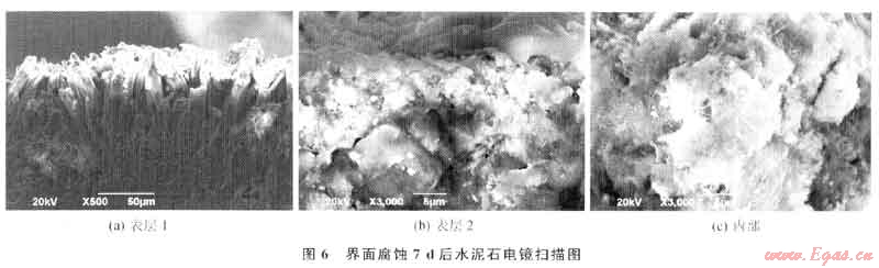 由顯微照片圖6-a可以看到腐蝕后的水泥石表面包裹著一層腐蝕產(chǎn)物,由掃描電鏡(sEM)看出該包被層屬于致密性的。在致密包被層的下面是水泥石的內(nèi)部結(jié)構(gòu),由圖6、7對(duì)比看出,腐蝕后的水泥石內(nèi)部結(jié)構(gòu)相對(duì)致密層來說較為疏松,能觀察到部分較大的孔洞,這些孔洞可能是腐蝕介質(zhì)和水泥石中的水化產(chǎn)物反應(yīng)留下的,同時(shí)反應(yīng)的腐蝕產(chǎn)物通過孔洞和凝膠孔等被運(yùn)移到水泥石的表面,最終使水泥石的表面形成致密包被層。