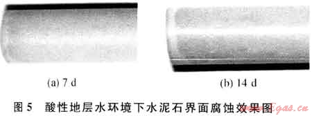表4是指定水泥石在水濕H2S+C02復(fù)合酸性氣體環(huán)境及酸性地層水中界面腐蝕7d和14d后抗壓強(qiáng)度變化情況。