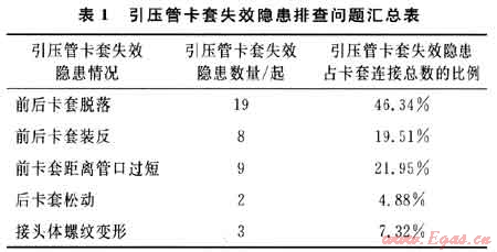 4) 安裝過程中易將前、后卡套裝反或漏裝,導(dǎo)致引壓管蹦出。