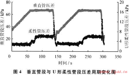 圖4是氣液相折算速度都為0.10m/s時(shí)U形柔性管段壓差和垂直管段壓差周期波動圖。由圖4可知,液塞在垂直管段生長時(shí),垂直管段壓差逐漸增大,U形柔性管段壓差很小而且穩(wěn)定;液塞到達(dá)垂直管段頂部進(jìn)入U(xiǎn)形柔性管段后垂直管段壓差不變,U形柔性管段壓差開始增大,垂直管段壓差要遠(yuǎn)大于U形柔性管段壓差,這主要是由于垂直管段的長度遠(yuǎn)大于U形柔性管段的凈垂直高度。