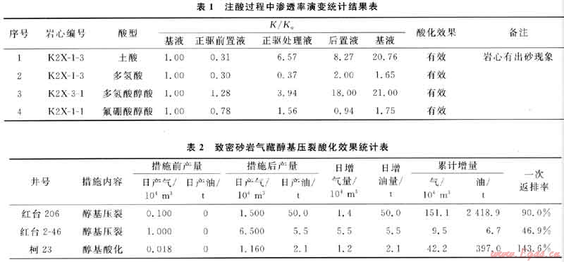 3) 醇基酸液性能研究表明,甲醇與酸液各種添加劑有良好的配伍性,醇酸具有很好的解除水鎖、促進殘酸返排、降低二次傷害等作用。